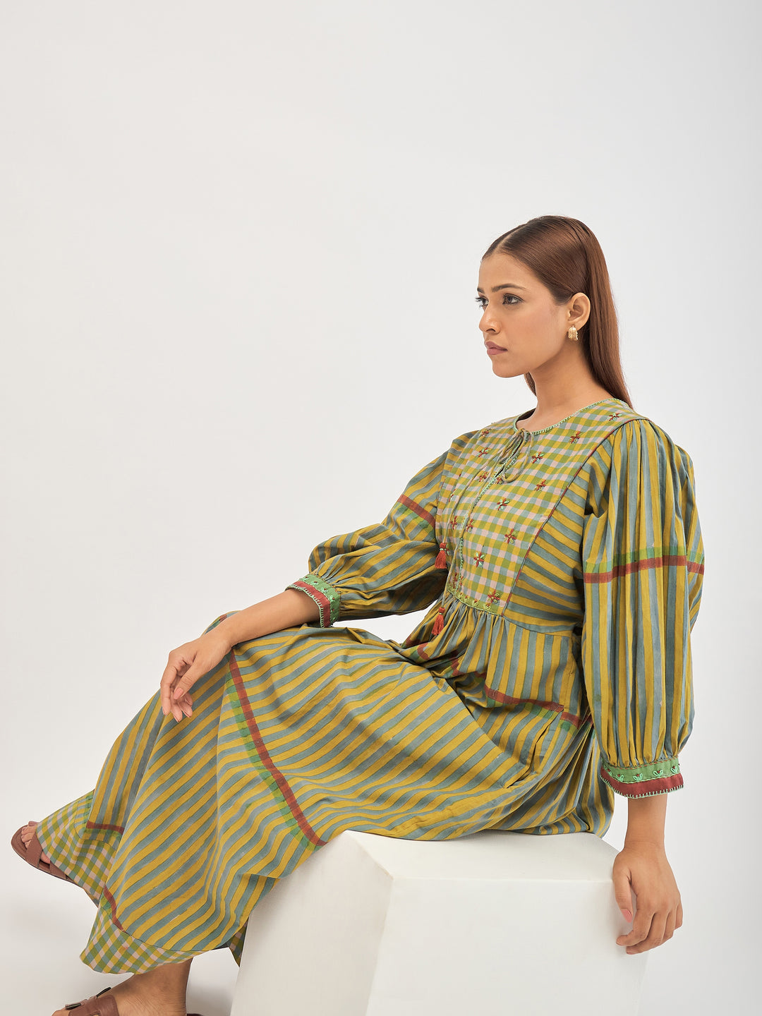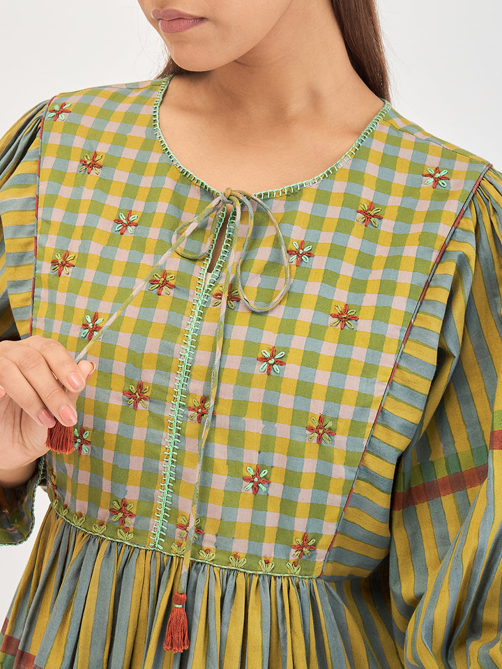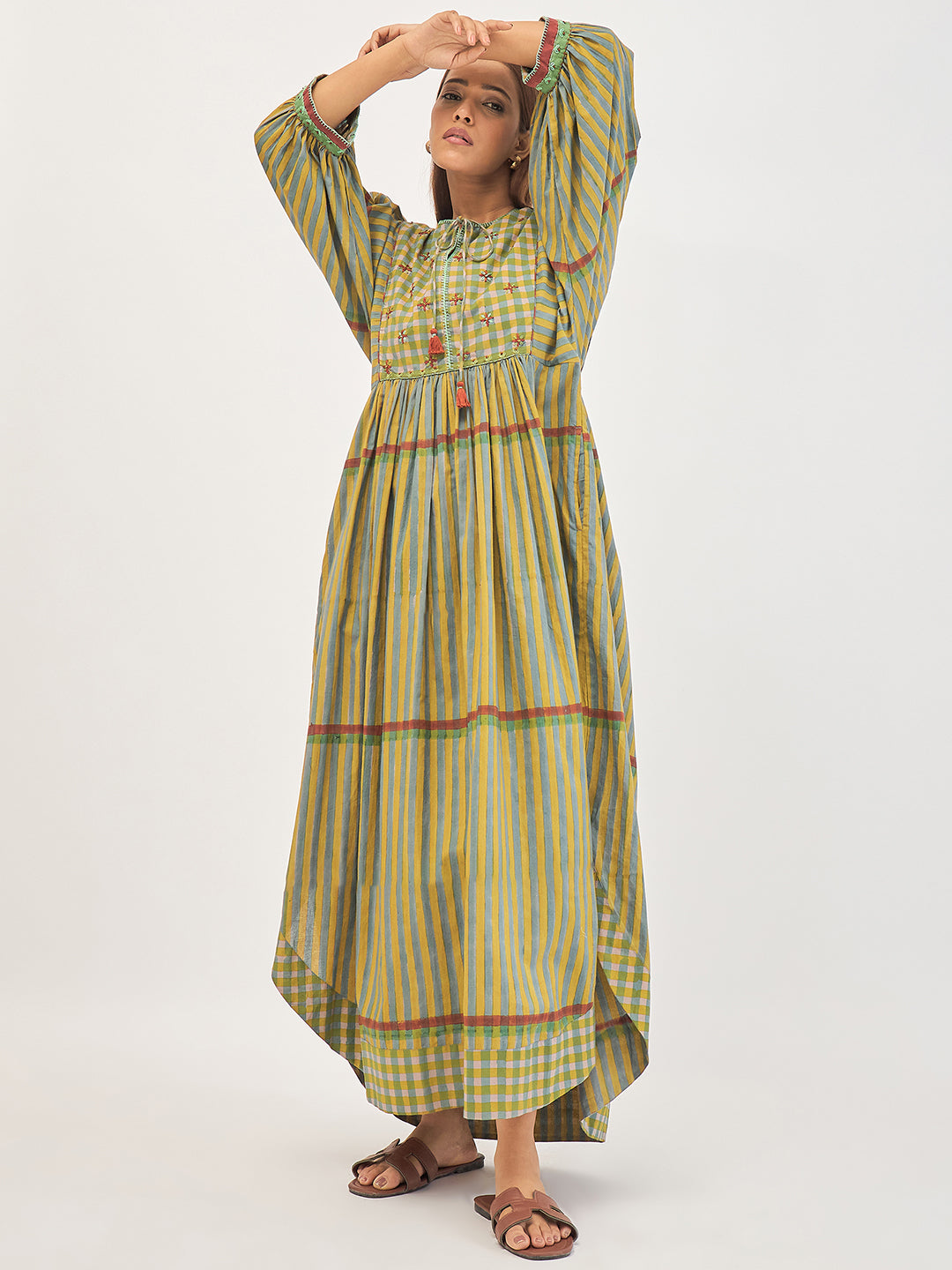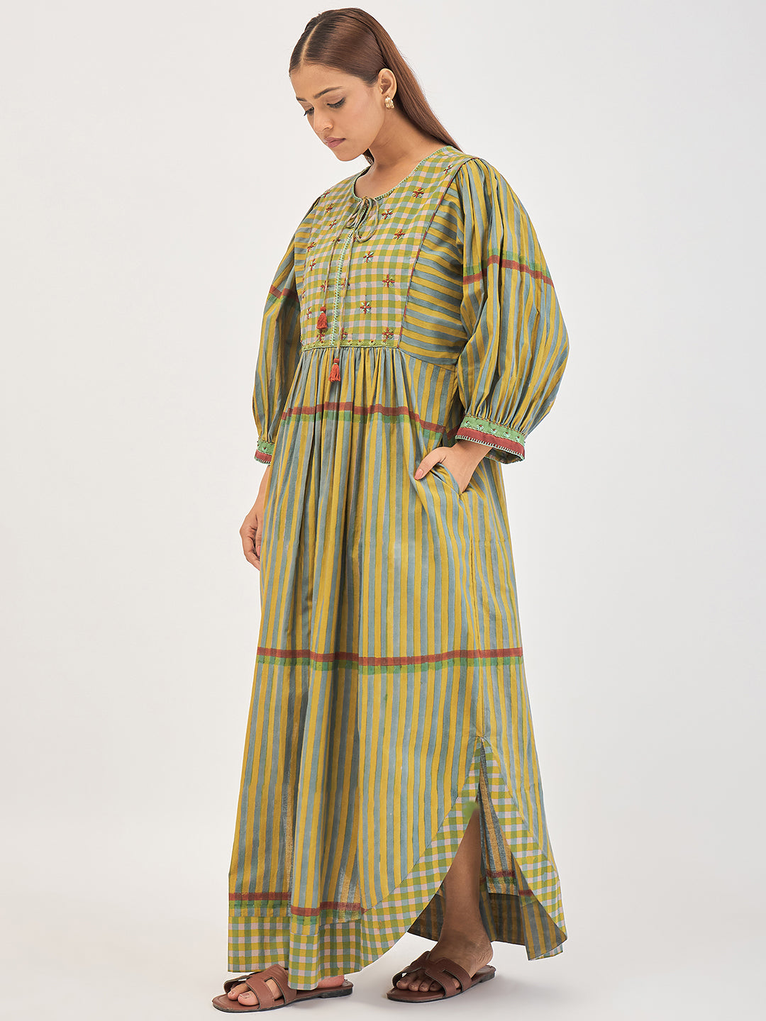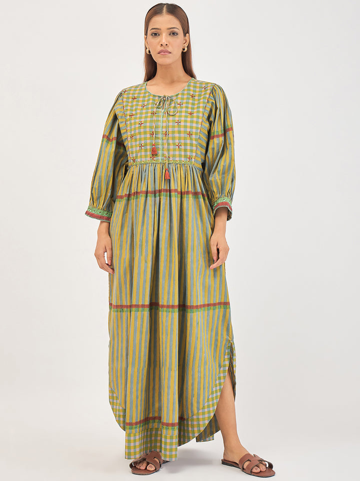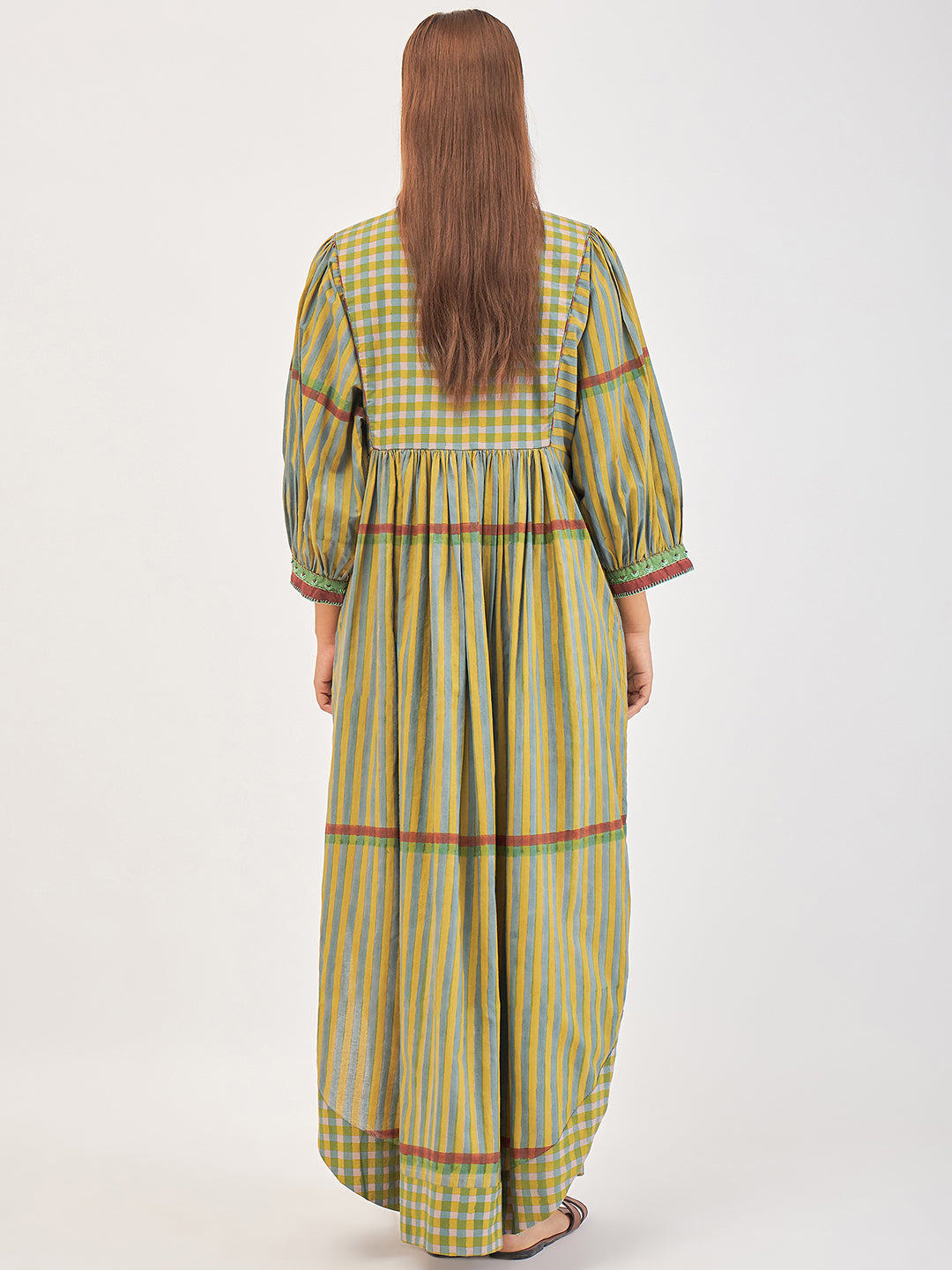 A graceful blend of tradition and ease, the Checks & Charms Maxi Dress is crafted from soft, breathable cotton and adorned with delicate hand block printed checks. This full-length dress features a relaxed yet flattering silhouette with a gently cinched waist and side pockets for effortless function.