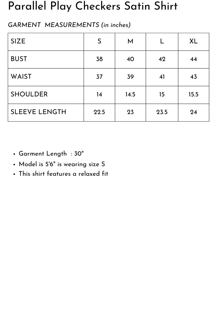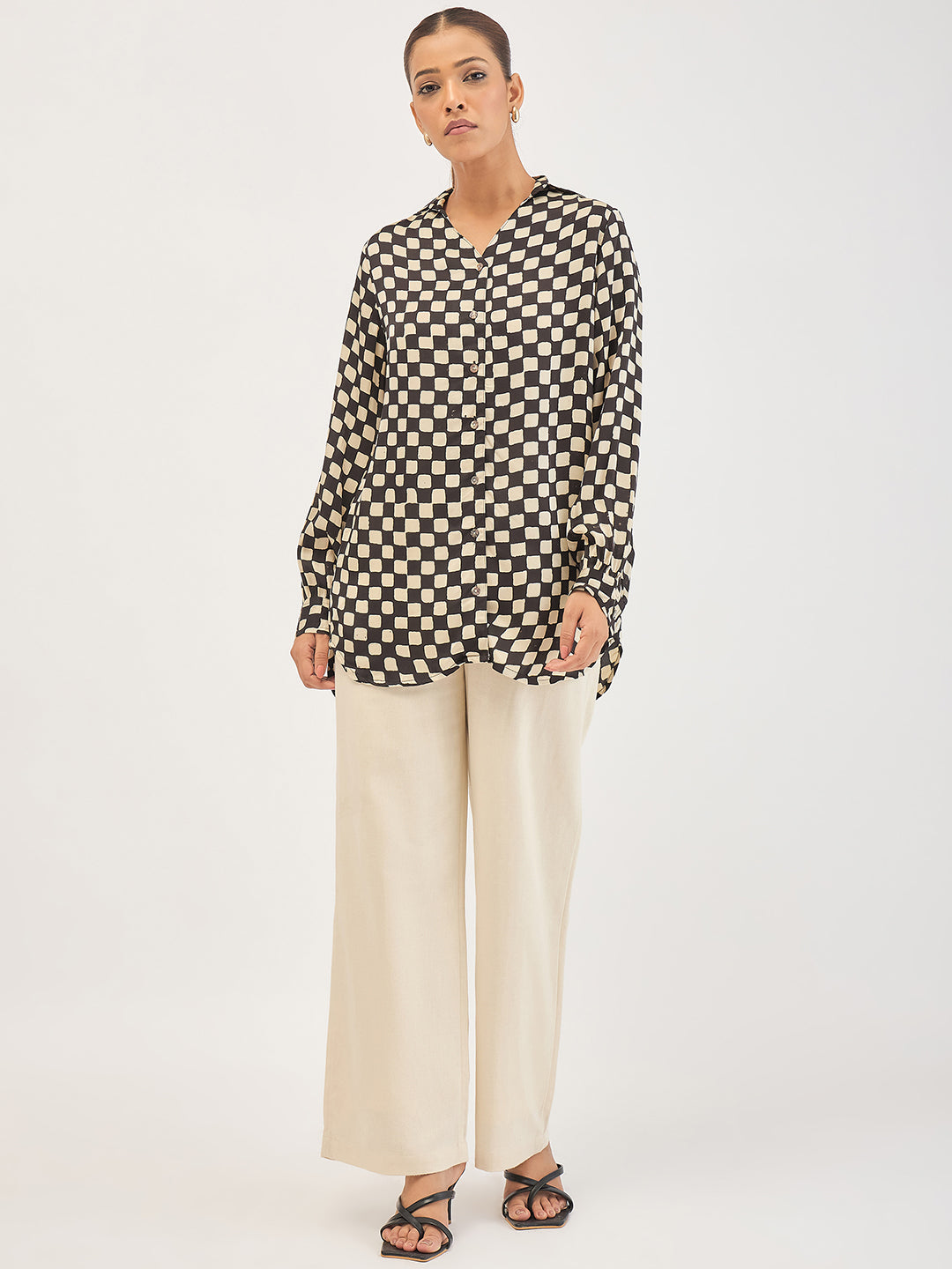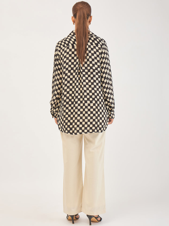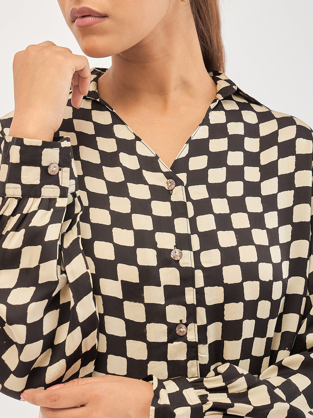 A bold expression of geometry and grace, the Parallel Play Checkers Shirt is crafted from soft satin and features a striking hand block printed checkerboard pattern. The clean lines and fluid drape bring a modern edge to traditional craftsmanship. With its relaxed fit and subtle sheen, this shirt transitions seamlessly from casual daywear to refined evening outings. Pair it with denims or tailored trousers for a smart, effortless look.