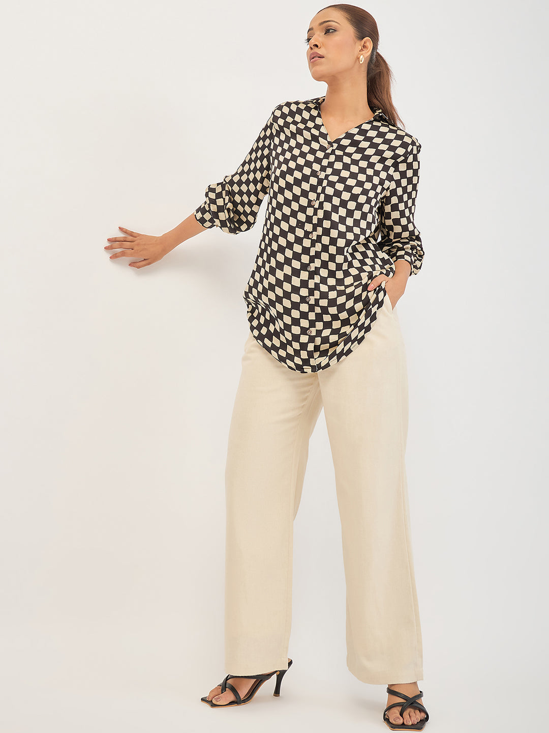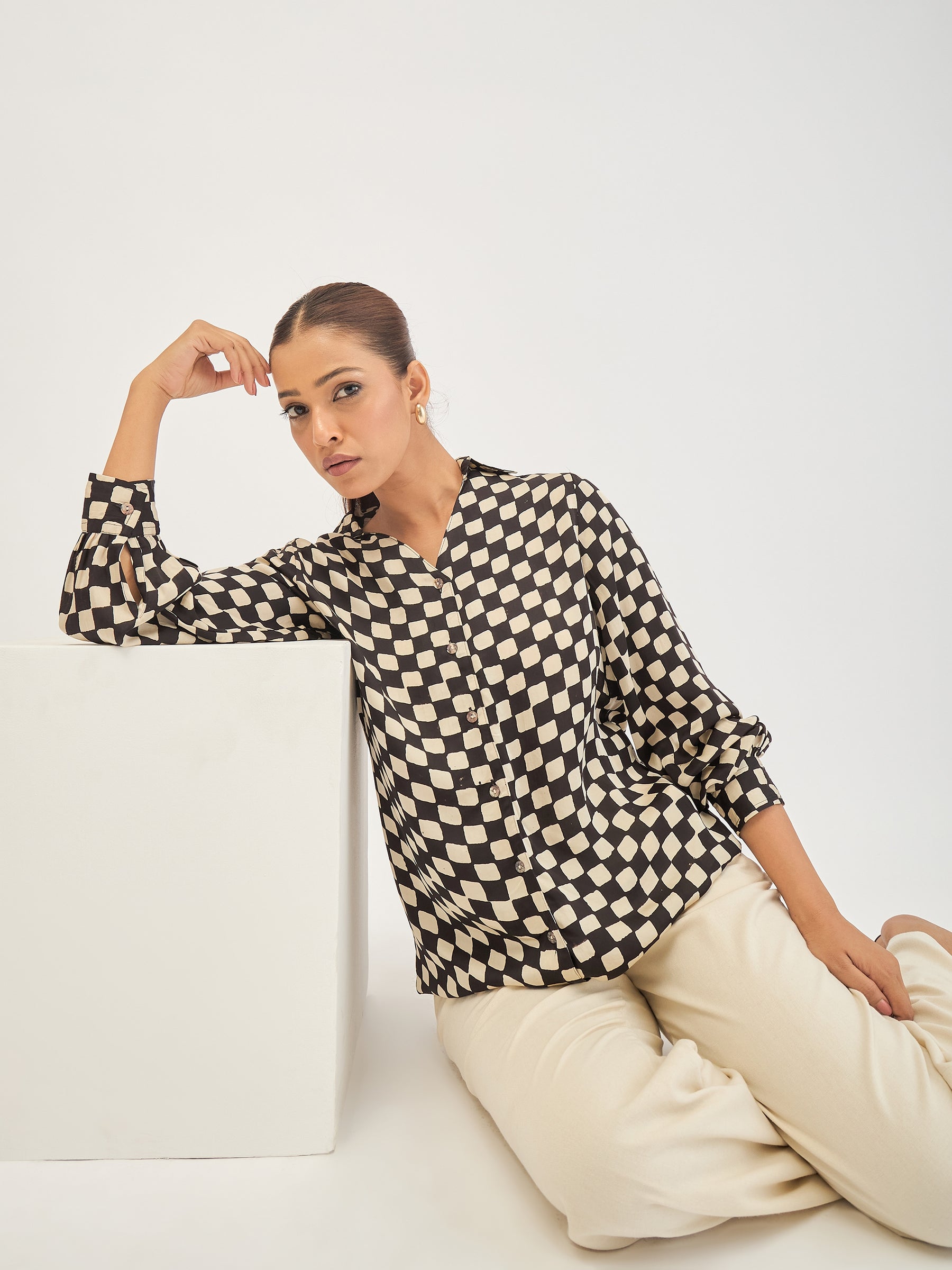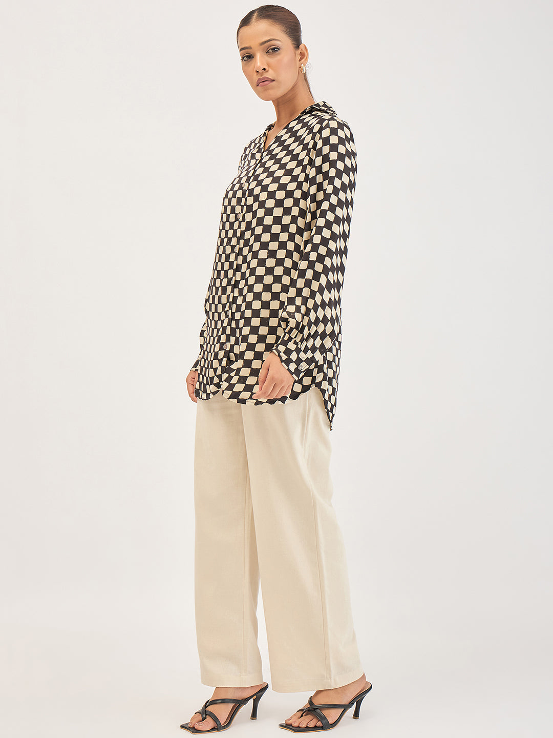 A bold expression of geometry and grace, the Parallel Play Checkers Shirt is crafted from soft satin and features a striking hand block printed checkerboard pattern. The clean lines and fluid drape bring a modern edge to traditional craftsmanship. With its relaxed fit and subtle sheen, this shirt transitions seamlessly from casual daywear to refined evening outings. Pair it with denims or tailored trousers for a smart, effortless look.